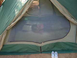 友人の設営したテントに寝転がる次女。
