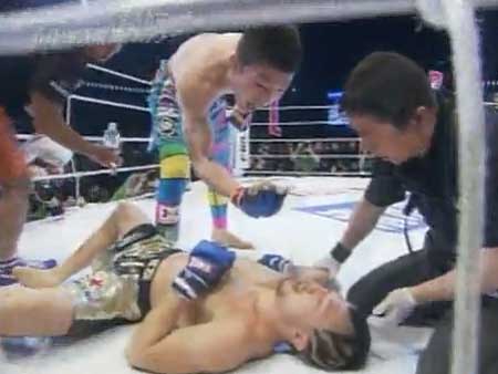 ↑ 腕を折った相手に中指おっ立てて挑発。