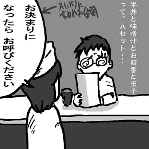 「牛丼大盛、あと玉子と味噌汁ッ!」