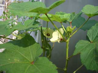 今朝方、オクラの花が二輪咲いていた。